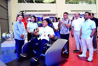 在全球研發(fā)中心展廳,代表團(tuán)一行深入了解柳工從創(chuàng)立至今在技術(shù)創(chuàng)新、市場(chǎng)拓展等方面的輝煌成就。現(xiàn)場(chǎng)觀看完5G智能遙控電動(dòng)裝載機(jī)的鏟裝作業(yè)演示后,代表團(tuán)成員還體驗(yàn)了遙控駕駛,這一智能技術(shù)應(yīng)用成果讓代表團(tuán)大開(kāi)眼界。