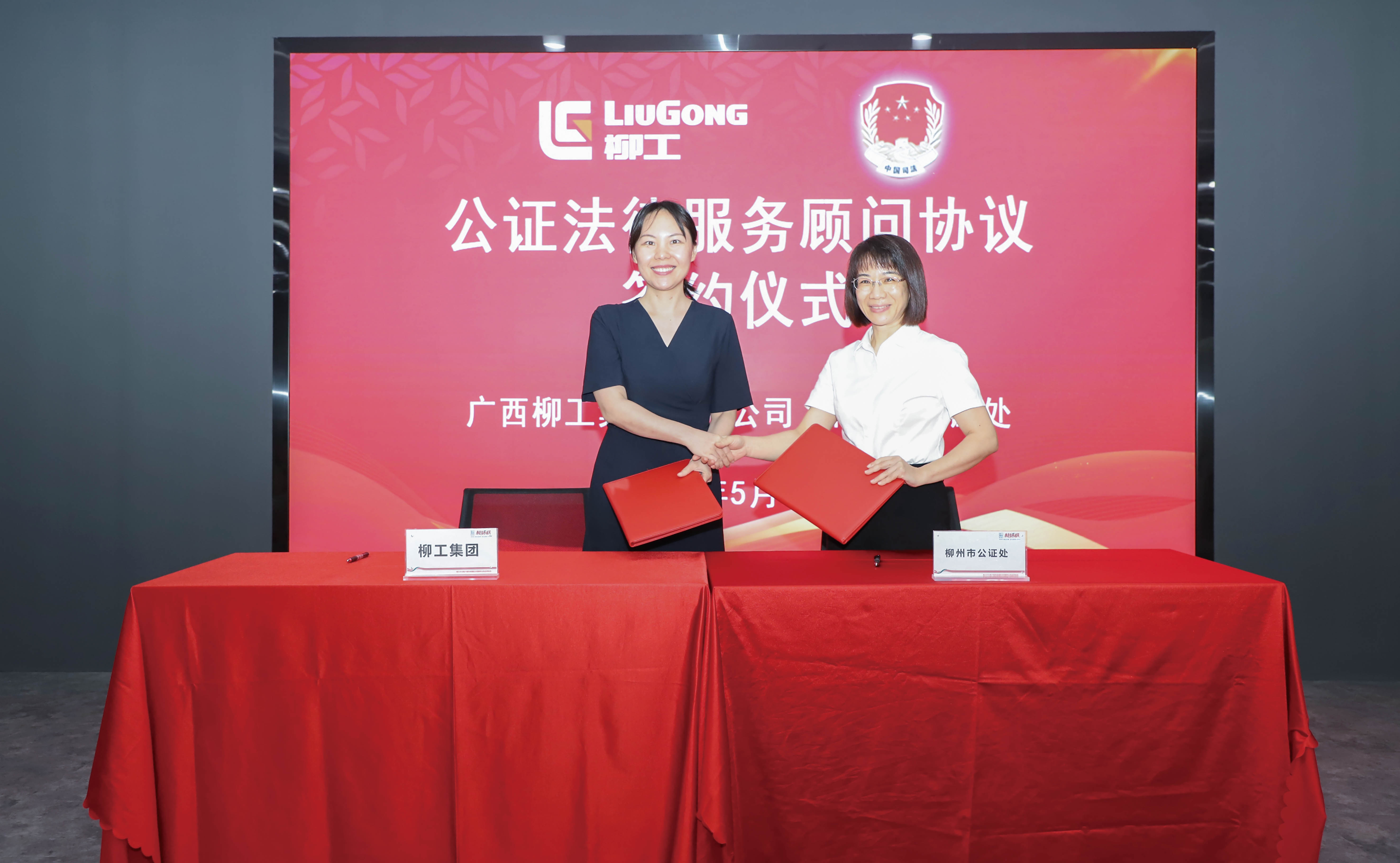 座談會后,廣西柳工集團有限公司法務總監韋江溢、市公證處主任鐘百雨分別代表柳工集團、市公證處共同簽署了公證法律服務顧問協議。