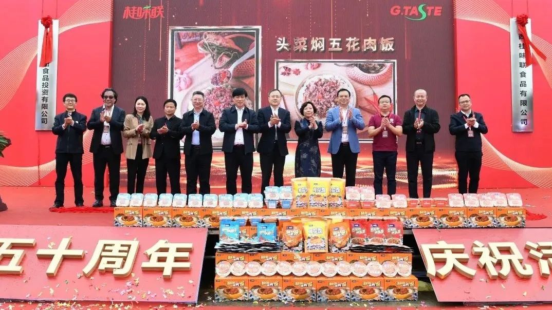 今天,在五十周年之際,肉聯廠公司迎來又一個歷史性時刻,肉聯廠公司正式更名為廣西柳工集團食品投資有限公司,肉聯廠全資子公司柳州天之業實業發展有限公司更名為廣西桂味聯食品有限公司,同時發布全新品牌“桂味聯”,以及“桂味聯”品牌系列預制菜酸筍黃豆燜魚仔、五花肉燜頭菜、黃豆魚仔飯、頭菜五花飯和桂花雞等五款新品,以全新形象奮進百年征程。