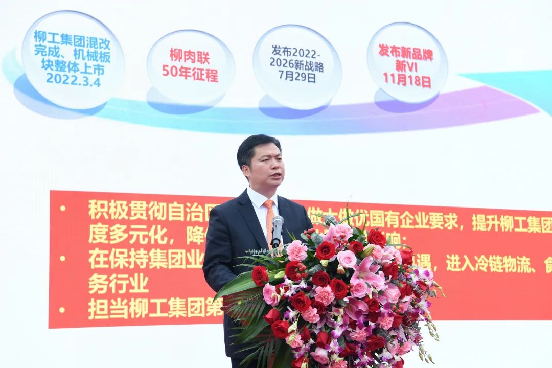 自治區國有資產監督管理委員會黨委委員、副主任唐愛斌,浙江大學食品工程學院副院長劉東紅,自治區糧食和物資儲備局物資與能源儲備處處長覃家權,自治區工業和信息化廳食品工業處處長周默,柳州市農業農村局局長曾和平,柳州市市場監督管理局黨組書記、局長蔣為民,柳州市發展和改革委員會副主任、市糧食和物資儲備局局長涂毅,柳州市柳南區委常委、紀委書記、監委主任葉青,柳州市供銷合作聯社黨組書記,理事會主任于祖斌,柳州市發展和改革委員會黨組成員、副主任楊壯志,柳州市商務局副局長關雁,柳州市柳南區副區長楊濟南,中國工程機械用戶委員會秘書長侯寶佳,廣西柳工集團有限公司黨委書記、董事長鄭津,廣西柳工機械股份有限公司黨委書記、董事長兼首席執行官曾光安,廣西柳工集團有限公司董事、副總裁、柳州肉聯廠有限公司董事長王太平,廣西柳工集團有限公司總會計師蔣博文,廣西柳工機械股份有限公司黨委副書記、紀委書記、工會主席李于寧等領導,以及柳工集團老領導、公司重要合作伙伴、經銷商、供應商、金融系統等代表出席本次活動并共同見證新公司名稱和新品牌新品揭幕。