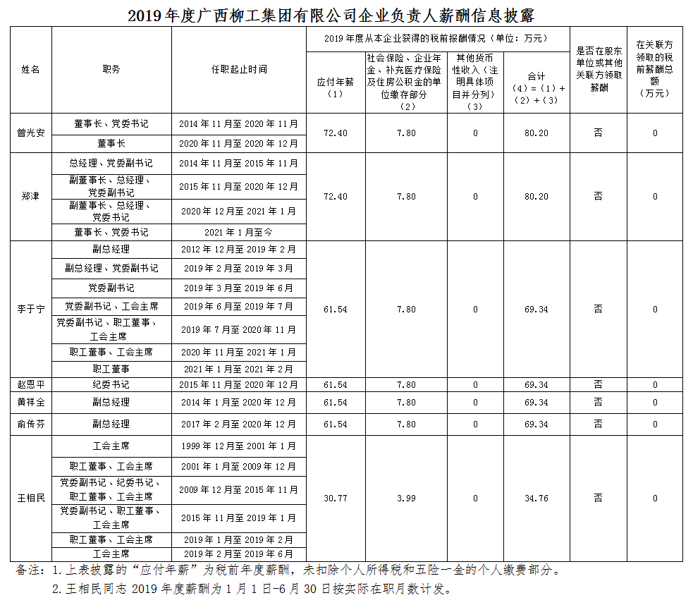 2019年度廣西柳工集團有限公司企業負責人薪酬信息披露