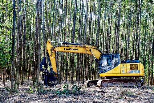 汽車飛馳在莫吉瓜蘇市平坦筆直的公路上,一路美景盡收,但進入林區后道路變得蜿蜒崎嶇,30多公里的路程,我們卻走了一個半小時。穿過大片大片整齊的桉樹林,在一片已經砍伐完成的木材旁,只見柳工CLG922E挖掘機正在矯健地揮舞著長臂進行裝車。不到十分鐘的時間,一大卡車木材便在柳工CLG922E挖掘機這個得力助手的幫助下裝運完畢。