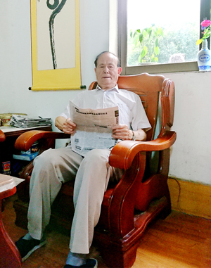 蔣曉榮在家中看報