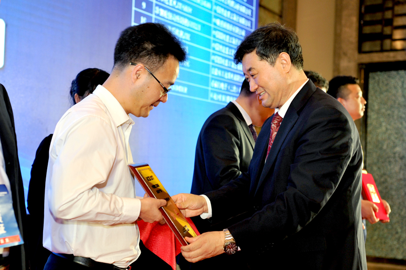 中國工程機械工業協會秘書長蘇子孟(右)為獲獎的廣西柳工股份公司頒獎